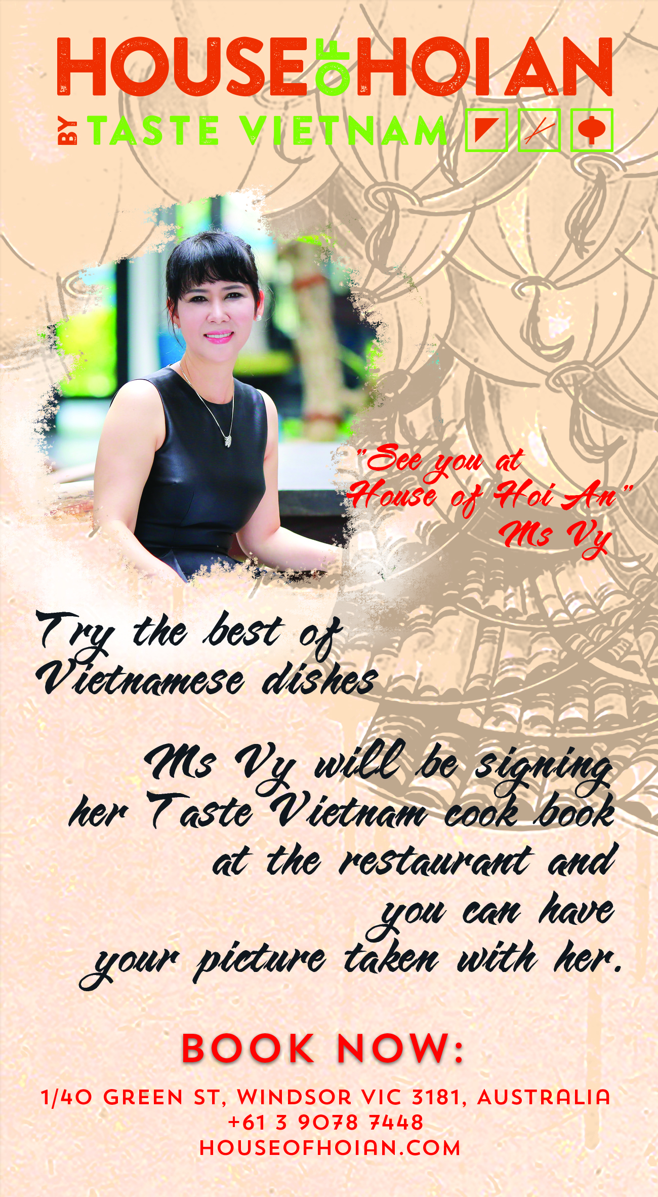 Ms Vy will be signing her TasteVietnam cook book at the restaurant and you can have your picture taken with her.